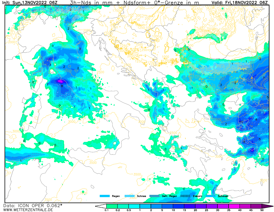 Накрая, две прогнозни карти на съвсем пресния рън (обновление) на модела ГФС и на немския ИКОН. С малка разлика, за периода чт срещу петък и самия петък те…можете да видите сами, защрихованата част са валежи от сняг. В регионите, които посочих в началото.