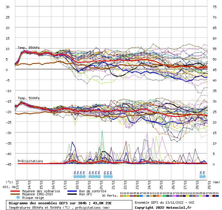 В този ред на мисли, при валежите, които с много голяма вероятност около тези срокове най-накрая ще са по-сериозни (сушата на много места в страната е свирепа, есенниците страдат), твърда или „размекната 🙂 фаза е възможна със сигурност в Стара планина, после, с намаляваща вероятност: -Предбалкана, Високите части на Северозапада, Лудогорието, високите полета на запад, вкл. Софийското. Обърнете внимание, че ако над 1800 метра вероятността за сняг е 80-90 на сто, в следващите степени тя пада с 20-25 на сто, т е за София към момента, според всички „усреднени“ прогнози на моделите тя е доста под 50 на сто. Защо, ще речете вие, запознатите със софийския мерзък зимен климат? Защото, ситуацията е много тънка, гранична и това се илюстрира, примерно, от сегашния ансамбъл на американския модел ГФС. Вижте:
