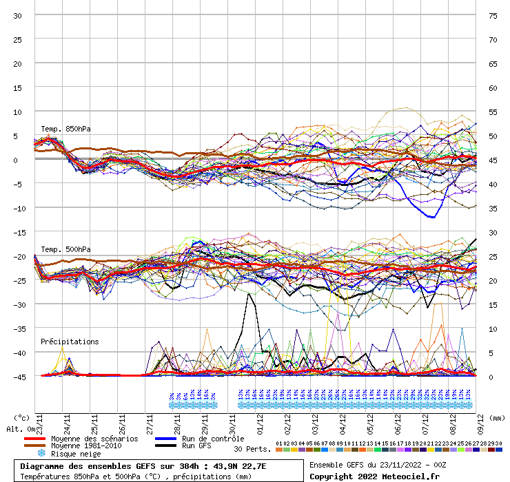 На графиката виждаме слизане на температурата във височина до под норма, макар леко, но леко, леко с до 2-3 градуса. Тъй като в момента слънцето практически е в най-слабата си годишна форма, това с голяма вероятност означава и норма-норма минус при земя – температурата, от която трябва да се пазим с по-дебели дрехи от тези до днешния ден. Кафявата линия – нормалните стойности за периода, червената – средната прогнозирана за различните резиденти (варианти на прогнозата при променени стартови условия). Видно от графиката, до края на месеца изненади са малко вероятни: приличен, умерен ноемврийски студ.