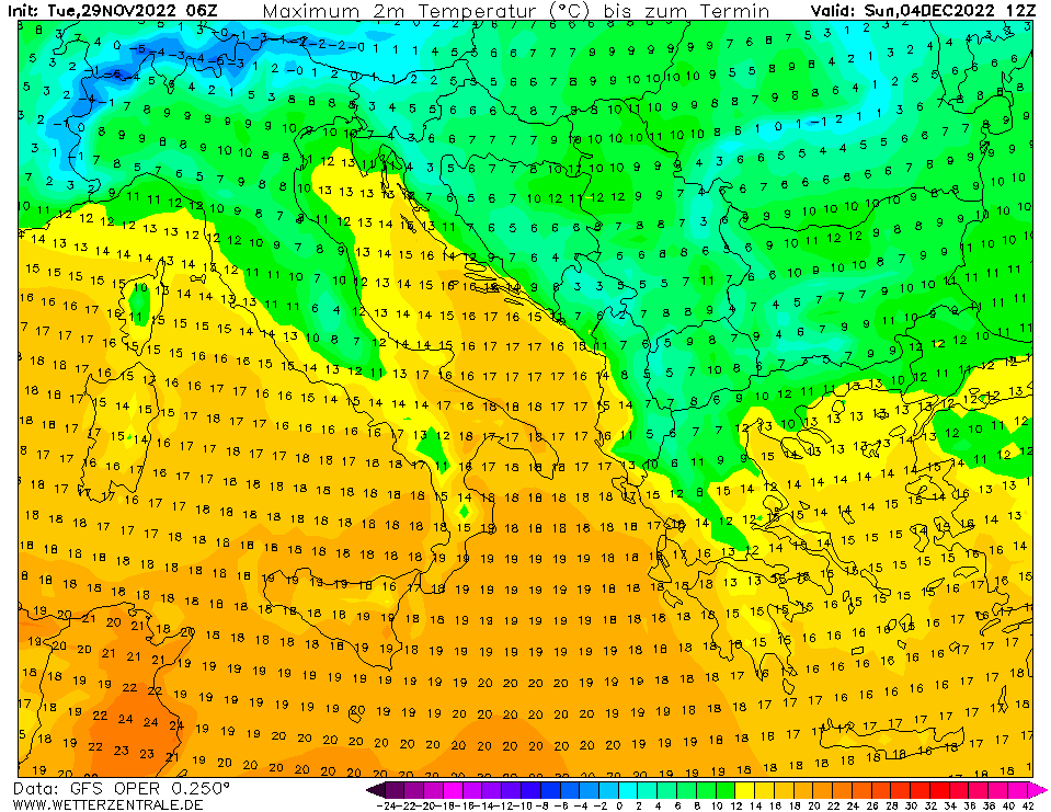 В следващите 2-3 дни остава студено, с нормални за декември температури денем, най-общо около 5 градуса. В събота и неделя добавяме по някой градус и отиваме към тези максимуми, до 10-12 (не навсякъде! градиентите са малки и в ниските части без вятър ще остава не кой знае колко по-тоопло от днес-утре). Долу са приблизителните максимуми в неделя.