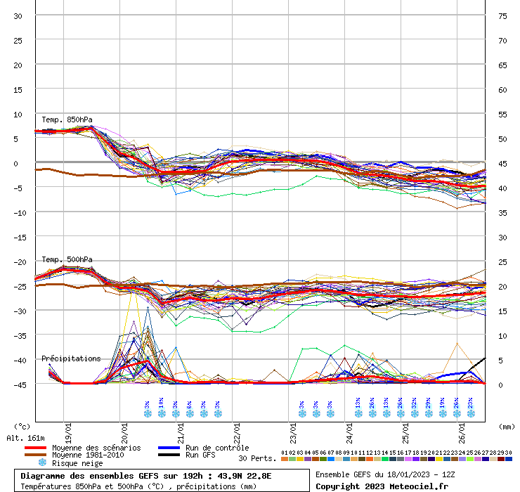 Застудяването ще продължи с още една стъпка в началото на следващата седмица, а вече близки или съвсем нормални януарски температури засега…остават в опашката – към 25-26 януари. На графиката с ансамбъла на ГФС за следващите 6 дни – реалните срокове, има застудяване/понижение, но не и истинска зима.