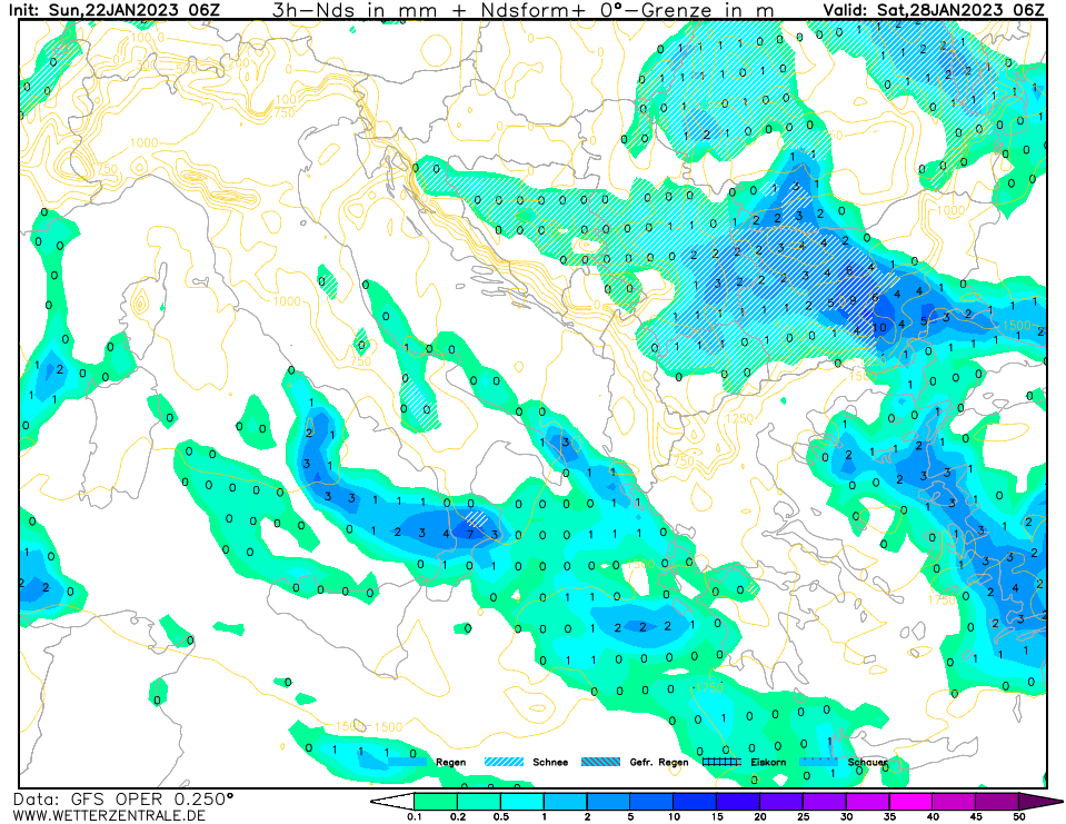 Защрихованата част е сняг. Тук спирам, като имам грях: трябваше да го направя още след първата картинка, в описанието за сряда-четвъртък. Първата картинка: имам предвид не кокошките, а фронтовата прогноза 🙂 Оставям последвалия текст само за да имаме база за сравнение как ще се развиват моделните сценарии с приближаването на срока. Резюме и забележка.