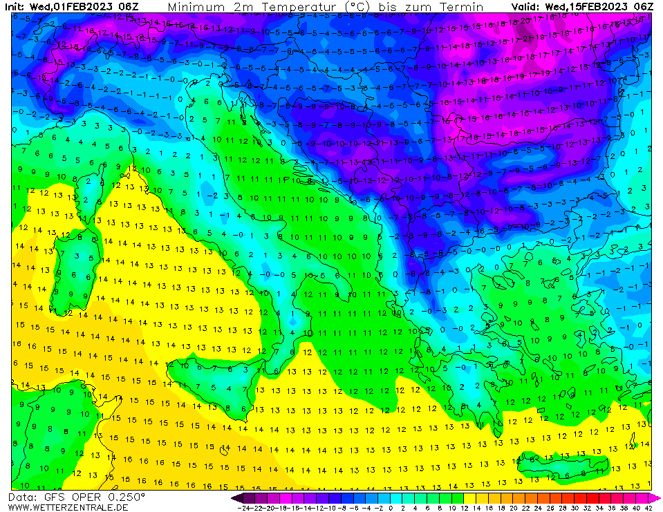 Обърнете внимание: при него отвореният коридор на север-североизток е много по-широк, гребенът е е забил много по-нагоре. Студът прониква и над Адриатика и Северна Италия – извитият полукръг там показва зараждане на средиземноморски циклон. В следващите срокове този циклон образува обща долина с тоя над Черноморието и студът намалява значително, особено на изток, но ни засипва със сняг. И после, когато в тила му нещата се кротват, инверсионните части може да издърпат от торбата с кръгли плодове един много дебел банан. Нещо такова (това вече е опашка, но подобрението е значително на фона на минимумите от предния материал преди обяд. Няма как да не му се насладите. Радост за окото на ценителя: