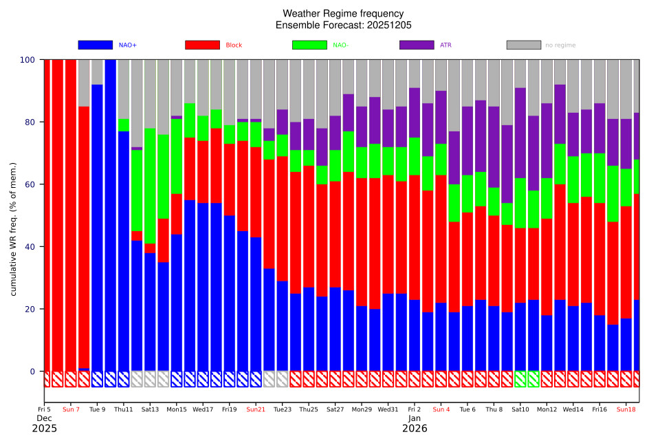 Това е прогнозата на ЕС за предстоящия режим на НАО. както виждате, в момента имаме скандинавски блок, но след малко ще ви покажа и картата „на терен“, от която ще е видно как това е по-скоро номинално: „Блокиращият“ гребен е толкова хилав, че и до Северен Беларус не може да прати някакъв сериозен студ и по-важното: такъв студ в близост просто не е наличен. Следва различен по продължителност сценарий с положително НАО, което е най-добрият вариант. Прибл. до Коледа или ден-два преди това, след което прогнозата в тоя и вид става неизползваема (няма доминиращ режим).