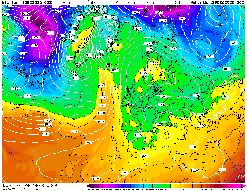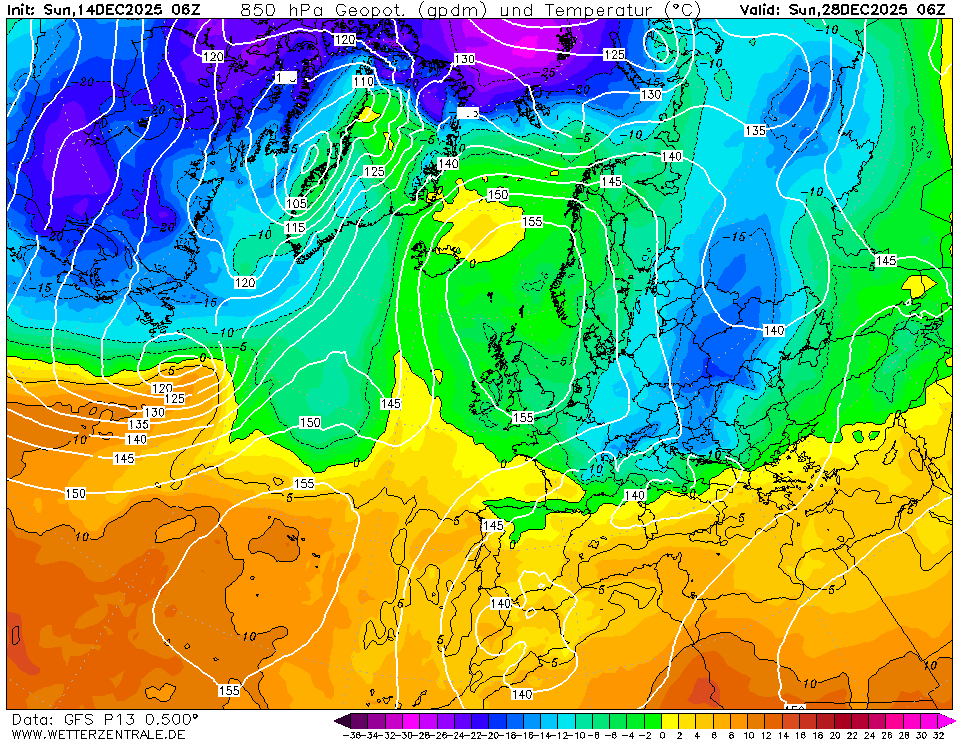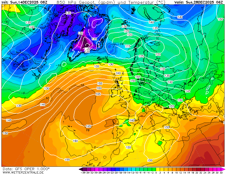 Може да се види типичен потенциално опасен зимен сценарий. Въпросният скандинавски блокинг е осъществен от чистопороден, расов антициклон с център където се полага (Скандинавия) с гребен към Украйна и друг – към Британия. Последният дори се свързва със седловина с Азорския му събрат. Понякога по подобен сценарий се случват най-тежките зимни инфекции, както през чутовния февруари 2012, но да оставим тези забравени кошмари настрана. Датата на картата горе е 29 декември, което наистина е прекалено напред, но ако не точно този, подобни сценарии в никой случай не бива да изключваме. Да, мнозина ще рекат: „дано да не стане“, но първо, по-вероятно е нещо подобно (след малко) да стане, всички модели са за смяна на циркулацията след Коледа, коментирахме в миналия материал. В тоя ред на мисли, приемете, че ще стане, вероятността е доста над 50 на сто. Ще последва ли задължително сняг и простотии? Изобщо не е задължително. Само, вместо сегашните весели положителни температури на 850 хектопаскала (приемете грубо, че това е на височина 1400 метра, демек горе на Петрохан 🙂 ) ще имаме вече отрицателни. Т е сега е теоретично невъзможно да вали сняг, а тогава вече ще бъде. Но за това, освен студа горе, трябва и валежна обстановка. Ще има ли такава? Вече няма как да я изключим, НО конкретика – с наближаване на сроковете.