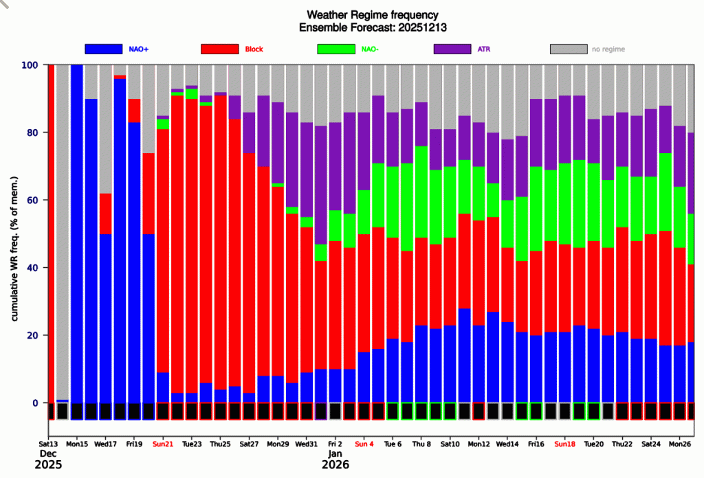 На горната снимка имаме най-актуалния материал на ЕС центъра за очаквания режим на НАО. Синьото, НАО+, е винаги добре: това означава, че горе около Исландия си вилнеят атлантически циклони, а долу, около Азорите има дежурният субтропичен антициклон (АЦ). Той е най-готиният зимен агент и единствения изцяло готин зимен антициклон. Тази конфигурация обикновено означава че в Южна Европа и често – и на Балканите, доминира пренос от западната четвърт, а дори да се окажем в някакво блато (ако основният поток е северно), пак е срв добре, тъй като дори да не ни грее директно, тази атмосферна река гарантирано блокира евентуален северен миазъм на някакви скапани арктични въздушни маси. Видно от картинката, до около 21 няма начин да получим зима. Всъщност инерциално това означава и още поне 1-2… сигурни дни след това без подобни простотии.