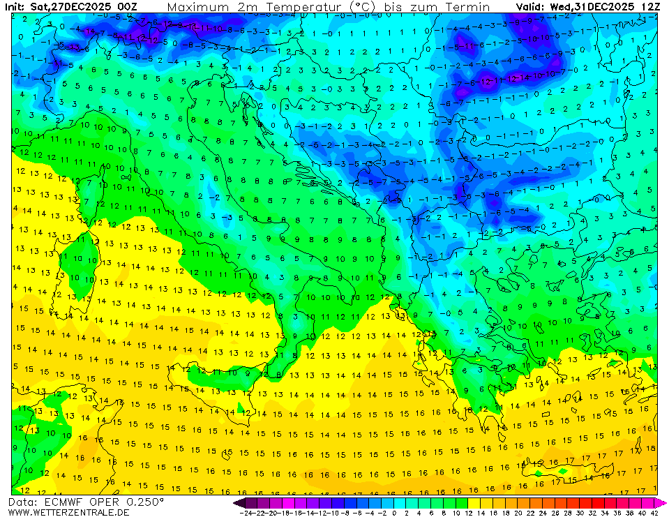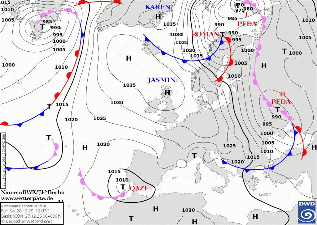 Да видим на последната карта циклонът Роман и партнюра му Педи, пардон, педа едно. Неговият студен фронт се спуска по пързалката на антициклона със следващата студена вълна, някъде към 30-31 декември и 1 януари. Там нещата са интересни и безспорно неприятни – за Гърция и Северна Турция : ))