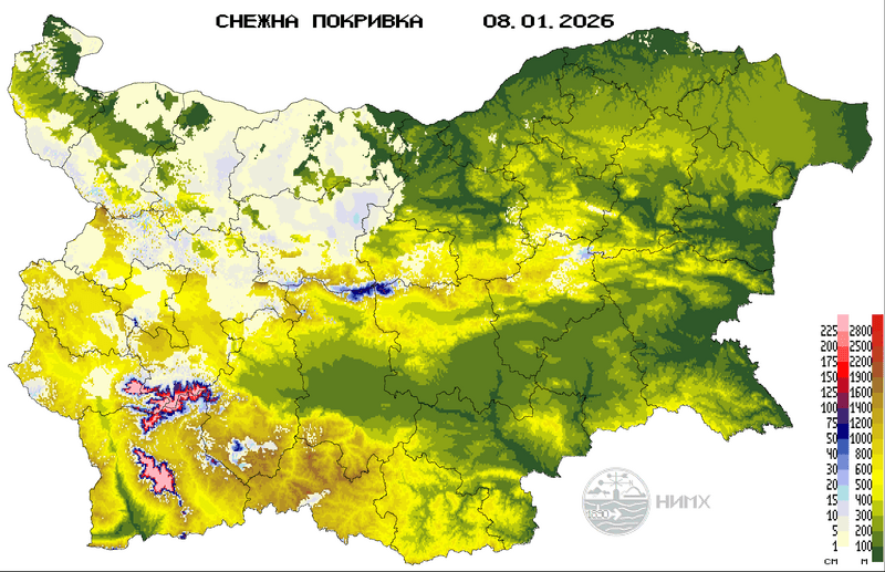 На картинката – снежната покривка над страната за момента. Данни на НИМХ. Вижда се, че освен в голяма част от плевенско, ловешко и източната част на врачанско, реално сняг няма. Изключение са северната и привитошката част на софийско (5 сантИма, но това -очаквано – не попречи градът да изпадне в хаос под мъдрото управление на ЛГБТ-кмета).