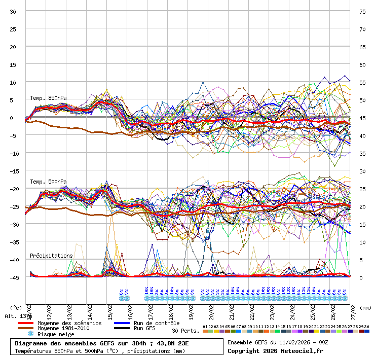 Все пак, за протокола набързо: Застудяването от неделя-понеделник, вече ще бъде друг тип – с бързи студени и условни топли фронтове, по които, както споменах ще има краткотрайни валежи (в неделя може и да гръмне тук-там, ако смогна, ще пусна отделна рамкова прогноза за този срок). Иначе конкретно прогнозиране по параметри за началото на следващата седмица към момента все още не е възможно, дори ако погледнем картинката с ансамбъла на моделите, в случая от снощи (обърнете внимание на хаоса, но рамкиран хаос, без големи скокове и пропадания на Т във височина). Накратко: Солидна динамика, но по часове и дори дни към момента – без сигурна консолидация.