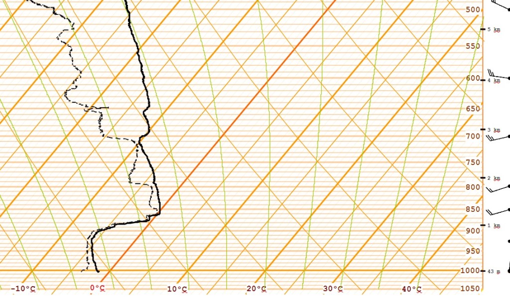 Гледаме дебелата крива на „мииметровата хартия“. Сондажът е от сутринта, затова в приземния слой имаме около минус 2 градуса. Нагоре температурата пада (проекцията по правите линии наляво към скалата долу показват реалната температура на височината – тя е показана на вертикалата вдясно. Нормално е, с повишаването на нивото, да става по-студено и обикновено извън зимата (с някои „тънки“ уговорки) е така. Вижте, обаче как тук, след първоначалното слабо изстиване изведнъж се затопля от ниво 6-800 метра до ниво малко над километър от минус 7 съответно до нула градуса. Вижте сега линиите, които слизат надясно и са почти (не съвсем) прави. те показват как би се затоплял обем въздух адиабатно, ако се сваля надолу до земята. Казано опростено, ако въздухът на километър и половина се свали до повърхността, при идеални условия и ако е достатъчно сух, за да не започне кондензация на излишната влага в него, той би се затоплил до… колко там – до 13-14 градуса. И април или края на март денем при слънчево време, точно така би станало. Е да, но сега, в реално последното утро на „истинската“ зима, не е 14, даже 5 не е, а минус 2-минус 3…. Така е, защото под това ниво има сериозен ‘скрит“, маскиран студ. Ако повторим мислено упражнението в обратна посока и издигнем единица обем въздух от 400 метра (който е с Т минус 6 да речем) на височина 1500 метра, то той би се охладил до минус 12-13 градуса. А всъщност, меренията показват нула. Обяснението: Този въздух до височина около километър е истинският продукт на северната зима, той е сравнително сух, образувал си е параметрите над степите на Украйна и Русия и по-на север и е вкаран между Карпатите и Балкана от изток и североизток. Натикан е там и трудно бива изкаран, макар че, разбира се, ще-не ще ЩЕ бъде изкаран. Иде пролет.